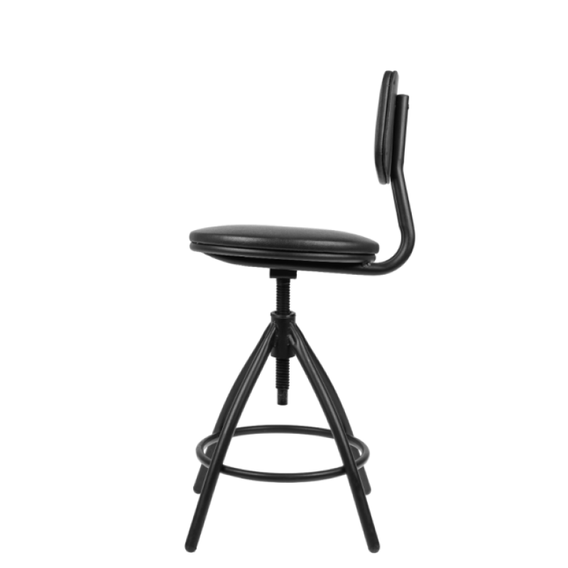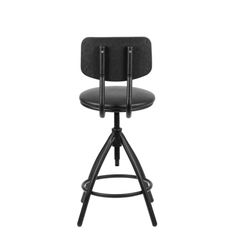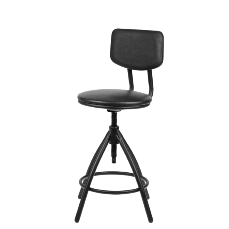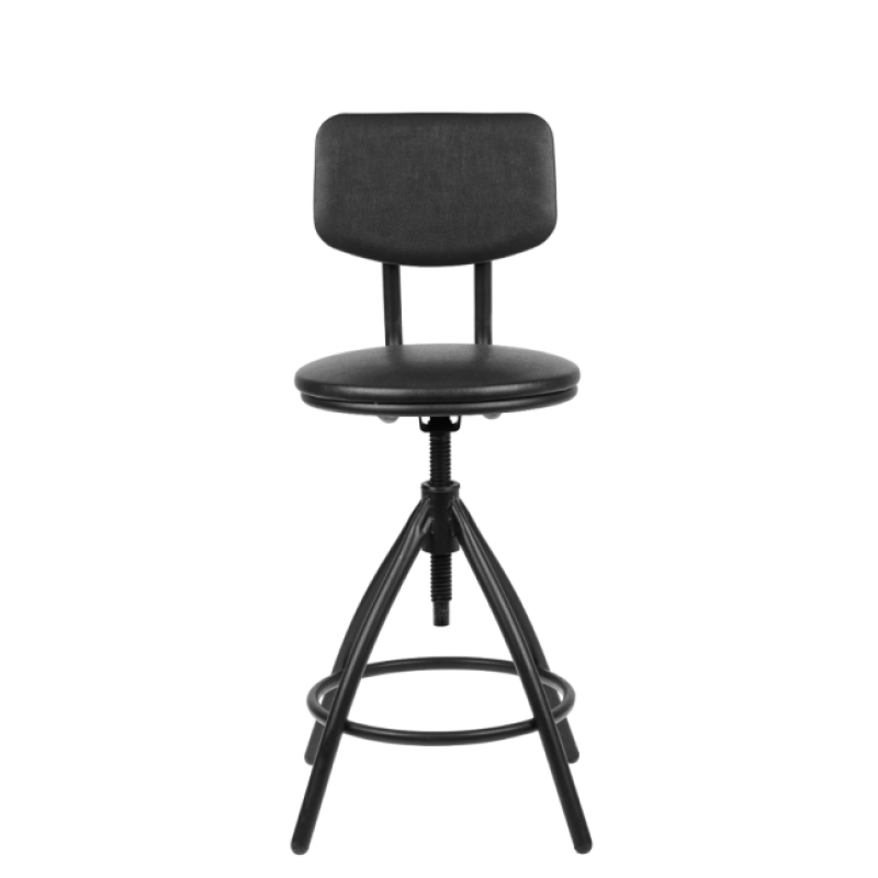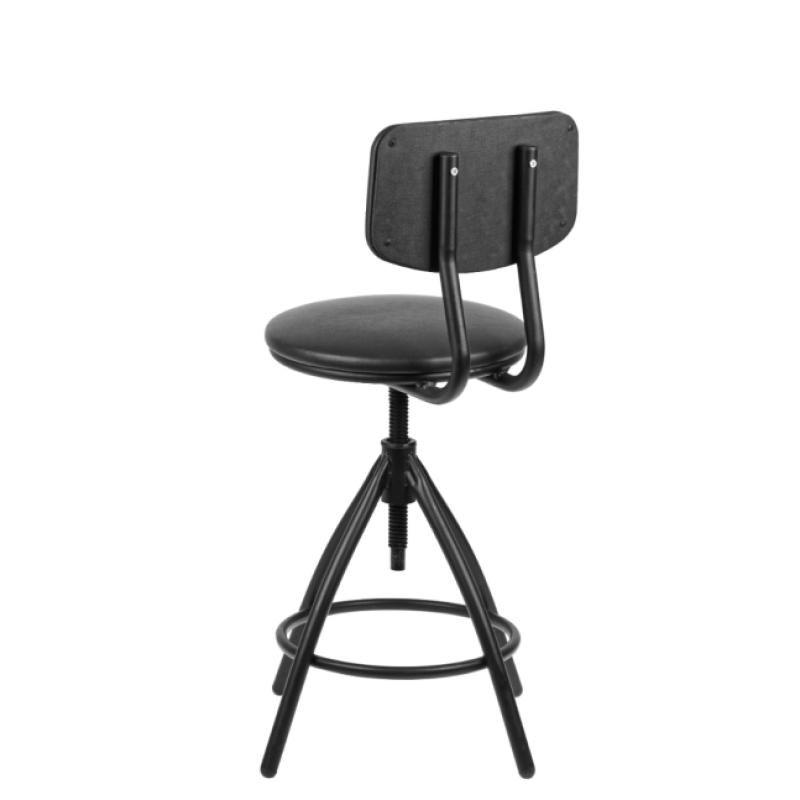 Стул винтовой на металлической опоре с пластиковыми заглушками, регулируется по высоте. Спинка имеет удобный эргономичный изгиб. Сидеть на этом стуле очень удобно, есть специальное кольцо – подставка для ног.